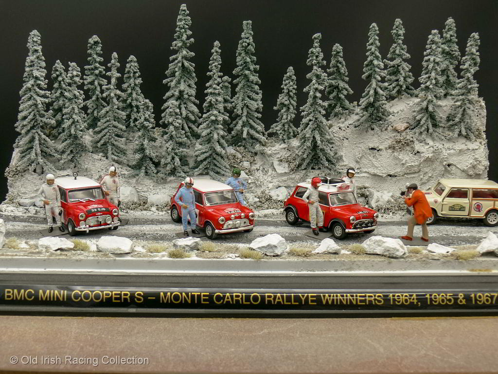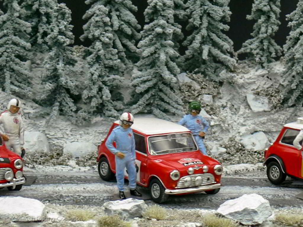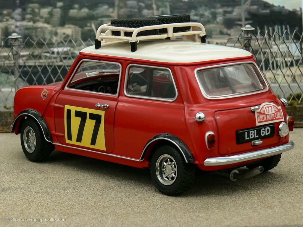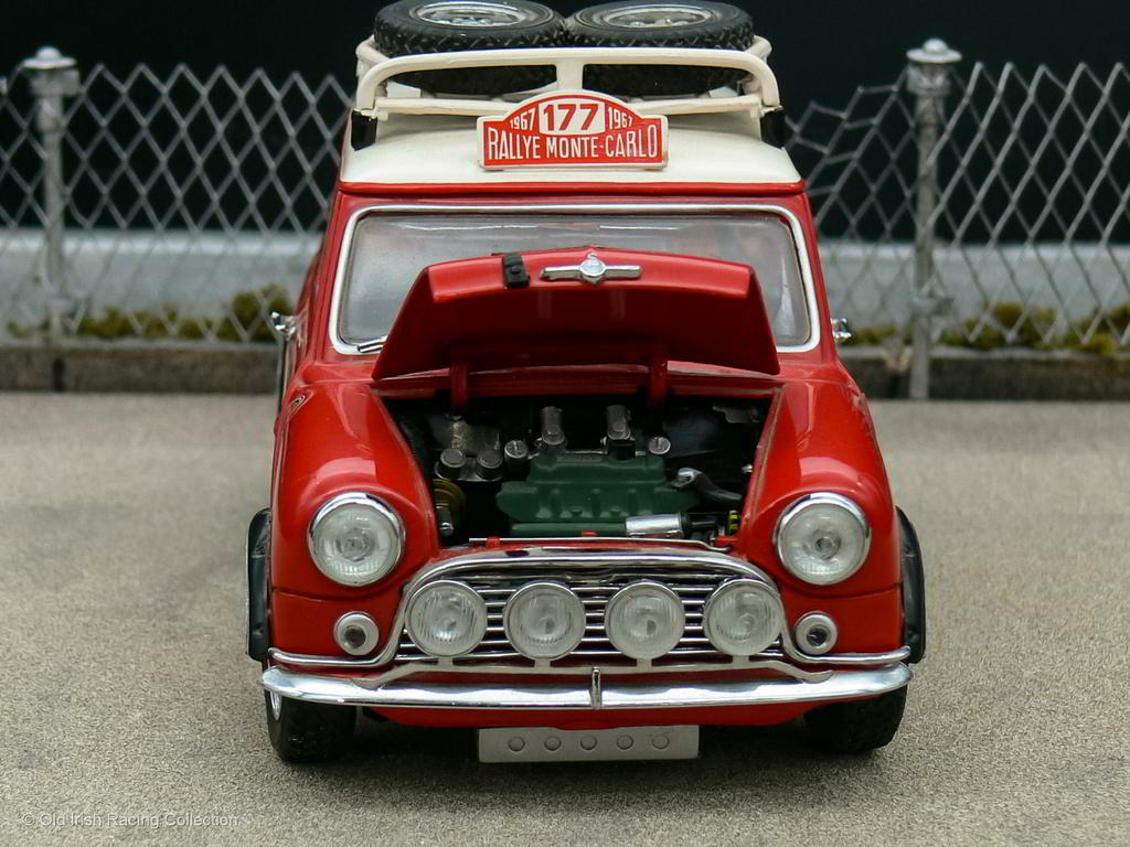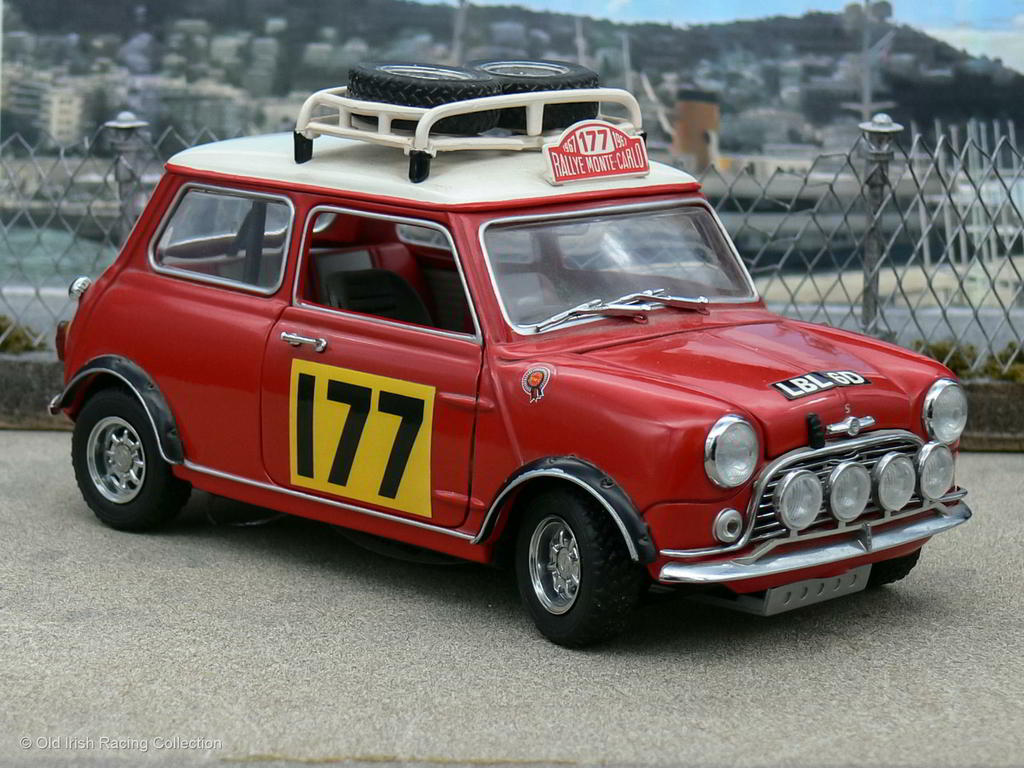 1967 BMC Mini Cooper S (Monte Carlo Rallye, 1967 - WINNER): A larger scale model of the 1967 Monte Carlo Rallye winner driven by Rauno Aaltonen and Henry Liddon. Model by KYOSHO 1/18 |