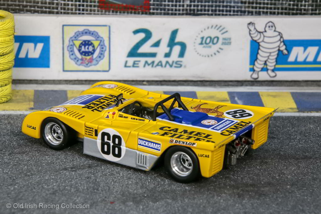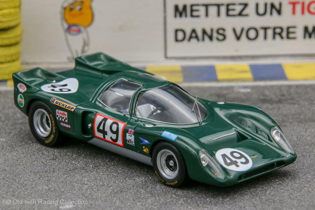 1970 Chevron B16-Cosworth (Le Mans, 1970): Driven by owner Ian Skailes and John Hines, this Ford Cosworth powered B16 failed to finish at Le Mans in 1970 due to valve gear failure. Powered by a 1.8L Cosworth FVC four-cylinder engine, the car was one of two cars entered by Chevron. They stopped for 90 minutes on Sunday morning to fix a seized tappet, only to exit the race after 213 laps in the 24th hour after having started 32nd on the grid. Its competition in Group 6 (P2000), aside from the other Chevrons, came from Ligier and Porsche 910s, outlasting them all. Model by SPARK 1/43 |