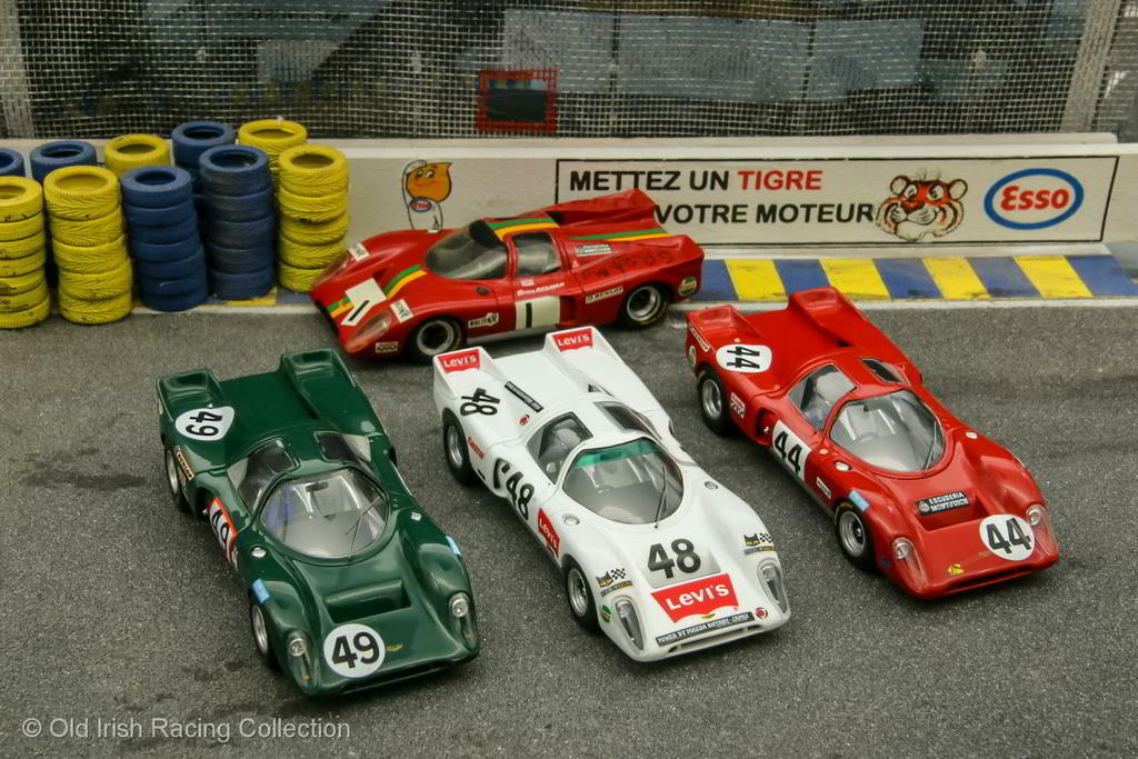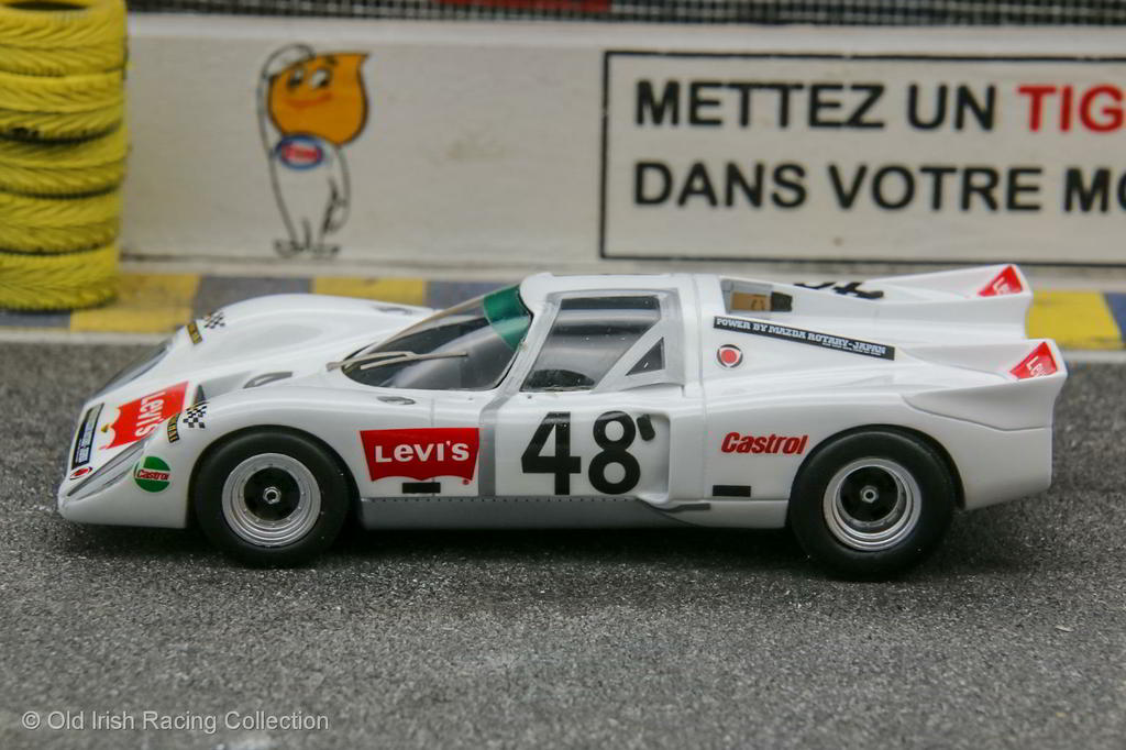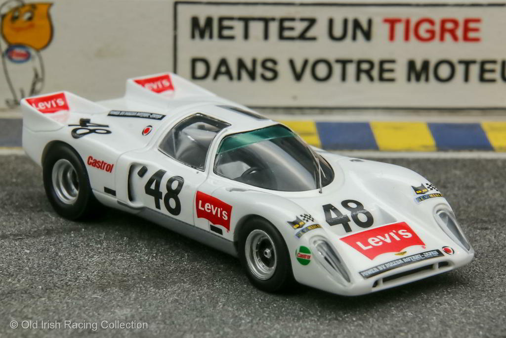 1970 Chevron B16-Mazda (Le Mans, 1970): Levis International Racing sponsored this 1.0L twin-rotor Mazda 2R powered engine B16, owned and driven by Jullian Vemaeve along with co-driver Yves Deprez. It started 48th on the grid, but the engine blew after four hours into the race, on the 19th lap. Of the Chevrons entered at Le Mans in 1970, all with different engines, this was perhaps the most radical with its twin rotor engine. The team had hopes of a better Le Mans finish after good showing at the Spa (15th) and Nurburgring (10th) 1000 Km races Model by SPARK 1/43 |