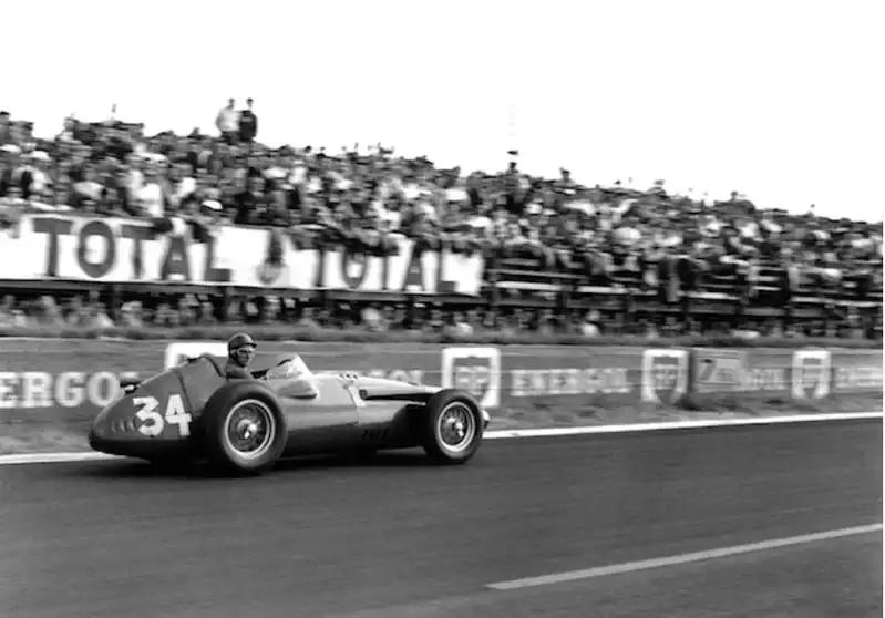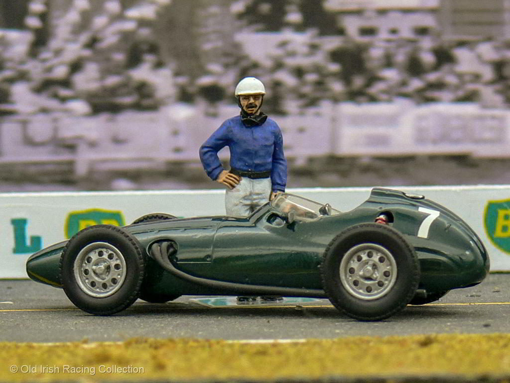 BRM P25 (British GP, 1956: At the start of the three-hour race, Brooks was quick away, trailing team leader Hawthorn in the early stages of the race. After a dozen laps he had dropped back to 4th, but stayed there following Moss, Fangio and Salvadori, with Collins constantly at his heels after Hawthorn had retired. It was looking like a good run for Brooks until Lap 40 when he had to stop to have his throttle control fixed. Repaired and on his way again, he almost made it to the race halfway point when his rear end seized, sending the car into an end-over-end pirouette down the track. Thrown clear, Brooks only received minor facial injuries, but the car burned. Moss and Fangio dueled for the race lead until Moss retired and Fangio took the win in his Ferrari. His only British GP victory.