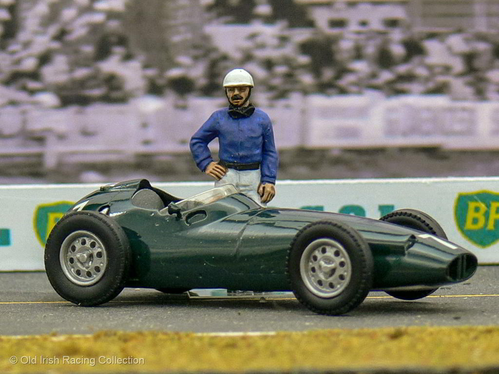 BRM P25 (British GP, 1959): Stirling Moss usual F1 ride in 1959 was Rob Walkers Cooper T51, but due to mechanical difficulties, Moss drove a P25 for BRM at the 1959 French GP. BRM had agreed to loan a car to British Racing Partnership (BRP) fr Stirling to drive. Pushing hard very hard to claim a new lap record on a very hot day, Moss spun on melting track surface tar and stalled his car while running third. His clutch gone, he tried push starting the car in gear but collapsed in the 110-degree heat. His next start in the BRM came at the British GP in the BRP livery seen here.