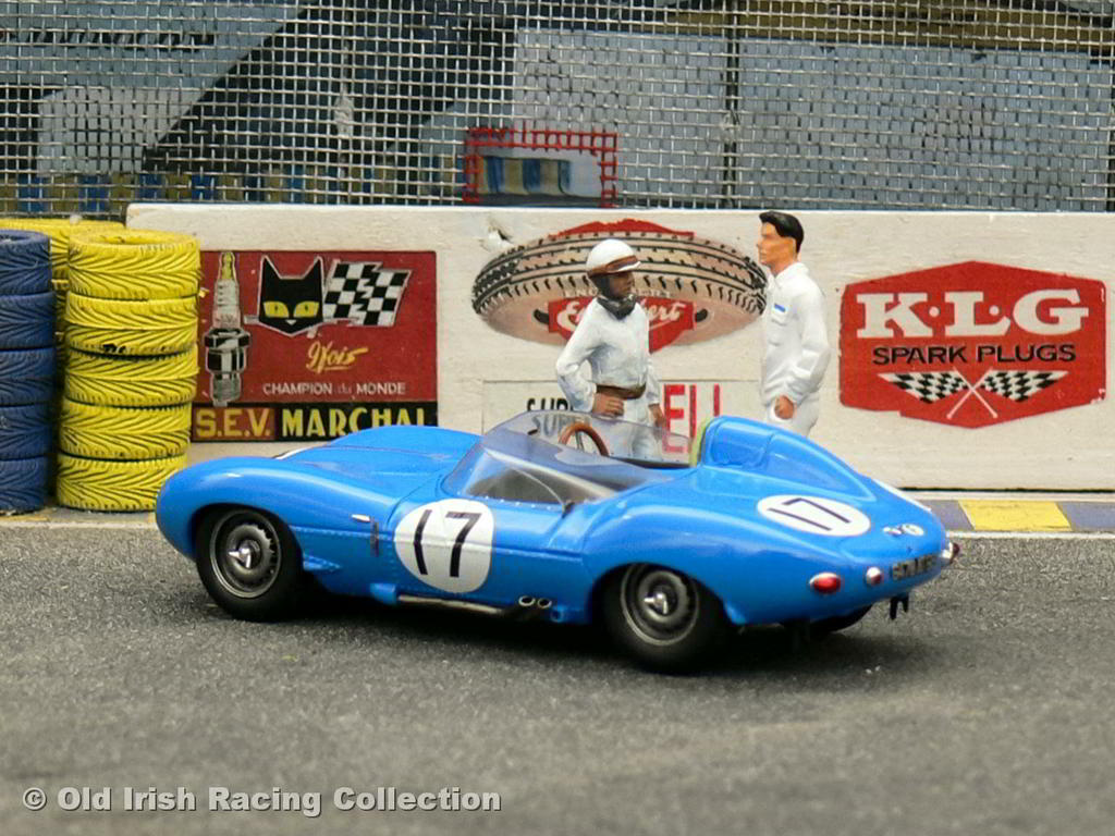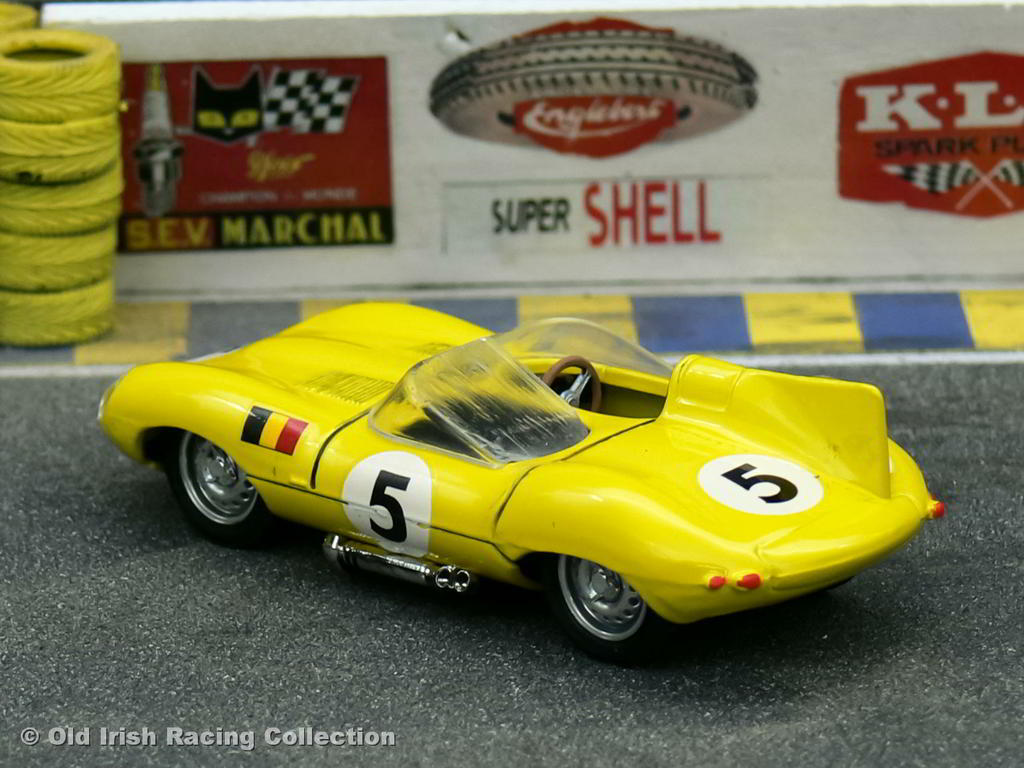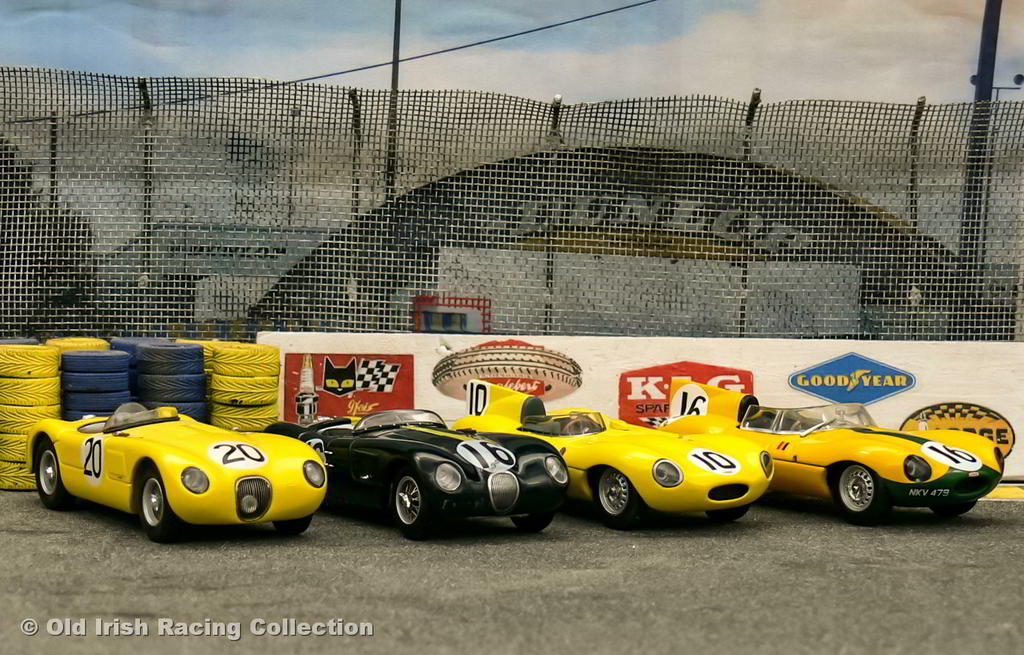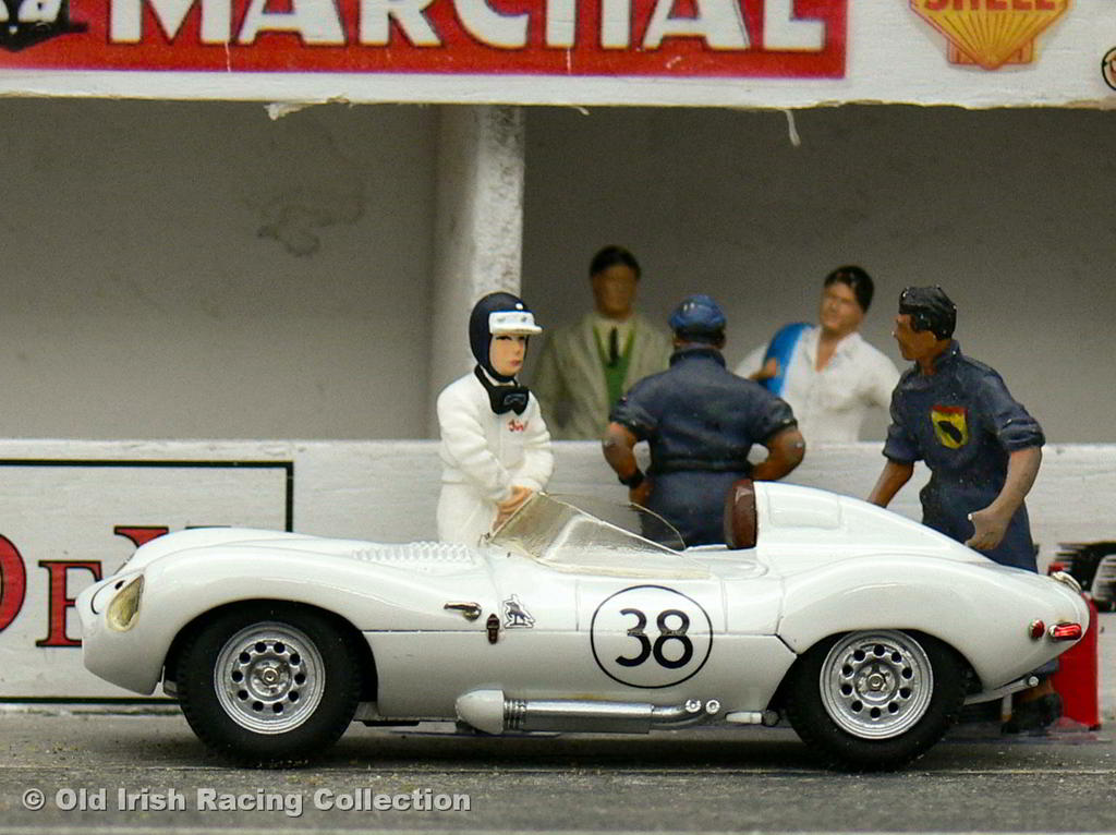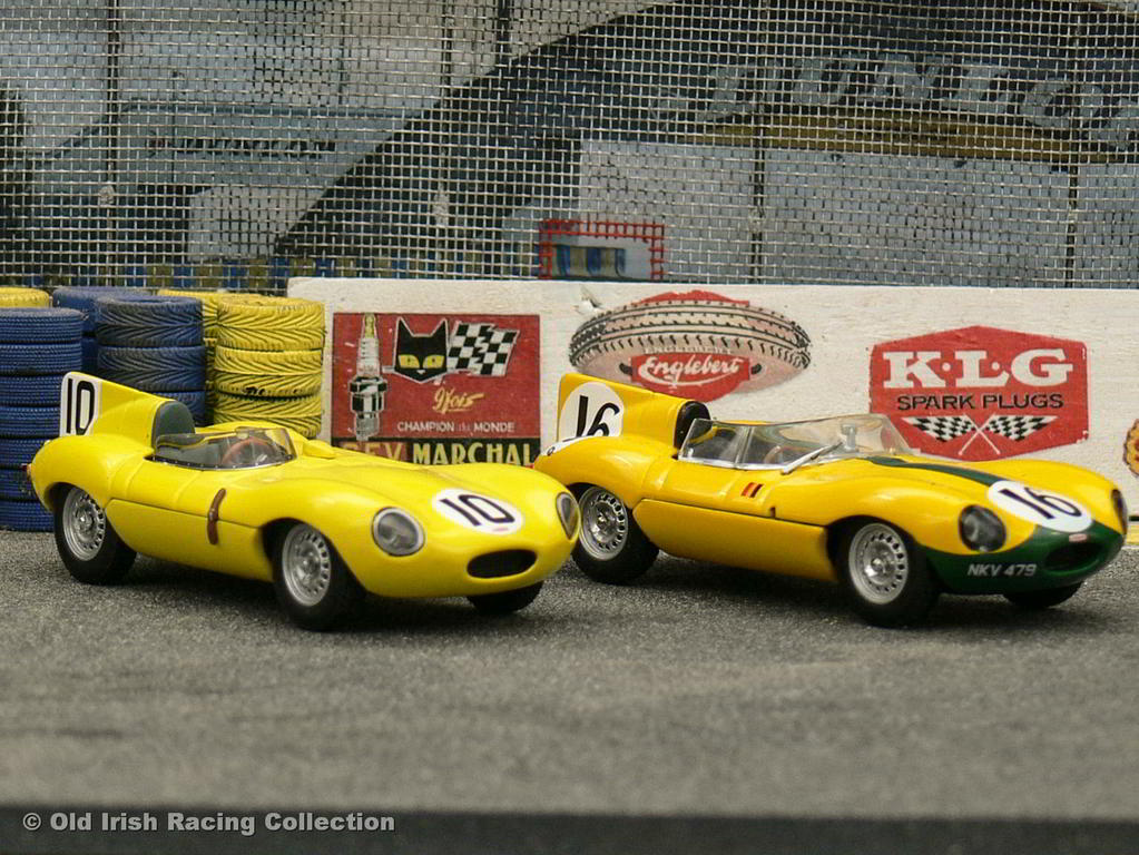 1959 Jaguar XK150S: Racing XK150's were rare, but in the hands of some drivers like a young David Hobbs, they were capable GT cars. With the 3.8L DOHC six-cylinder engine pumping out 280 bhp in tuned versions, its disc brakes gave it additional advantage over other competition whose brakes would begin fading long before the race ended. Model by AMR/DANHAUSEN 1/43 |