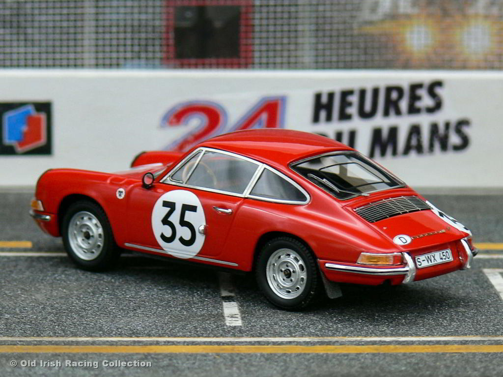 1966 Porsche 906/6 Carrera 6 (Le Mans, 1966): Porsche entered their 2.0L 906/6 at Le Mans in 1966 into the midst of the Ford and Ferrari war. They came out ahead of Ferrari by claiming the four spots behind the Ford GT40's in the first three places. Three of the 906's were Langheck versions entered in the prototype class and finished 4th-6th. This car, driven by Gunther Klass and Rolf Stommelen finished 7th overall and first in class. Model by HIGH SPEED 1/43 |