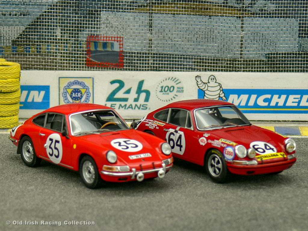 1966 Porsche 906 (Targa Florio, 1966 - WINNER): Targa Florio winners in 1966 Willy Mairesse and Herbert Müller drove this semi-works entry by Scuderia Filipinetti. The Porsche 906 or Carrera 6 was the last street-legal racing car from Porsche. 65 were produced in 1966. This allowed the model to be homologated for racing in the FIA's new Group 4. The engine regularly fitted was the 2.0L 6-cylinder lightweight racing engine with 220 hp and capable of 170 mph. At the 1966 24 Hours of Le Mans, the 906's placed 4-5-6-7 behind three Ford GT40 Mk II's. Model by EBBRO 1/43 |